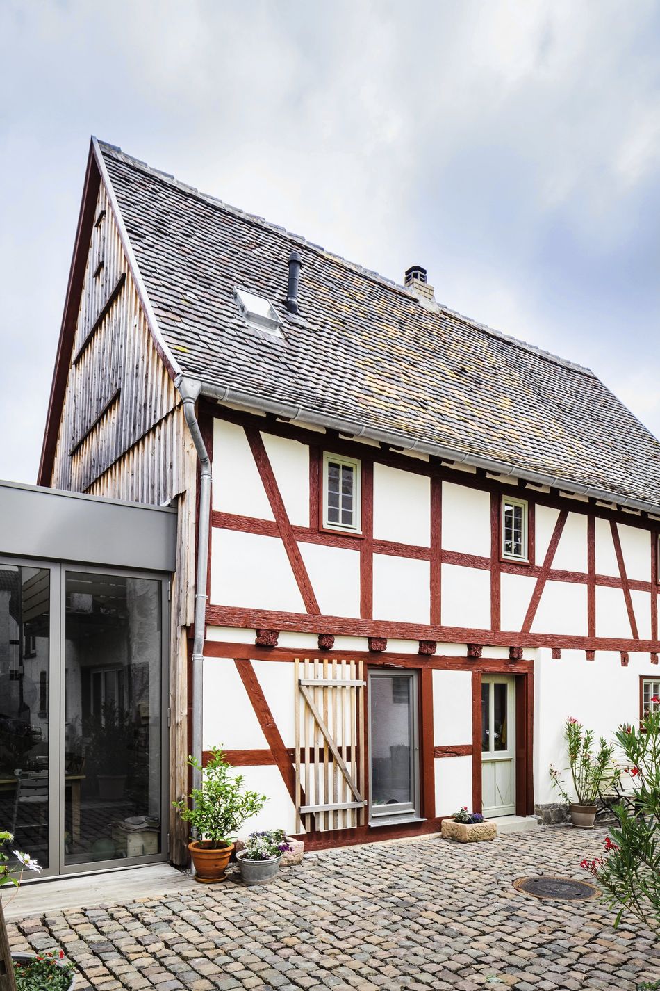 Das Dach wurde mit historischen Handstrich-Bibern, schwarz engobiert und vor rund 120 Jahren gebrannt neu eingedeckt. Uns freut dabei vor allem der Kontrast der Dachfläche zum bauzeitlich oxidroten Fachwerk und den historisch nachempfundenen Fenstern in blassem Grün.