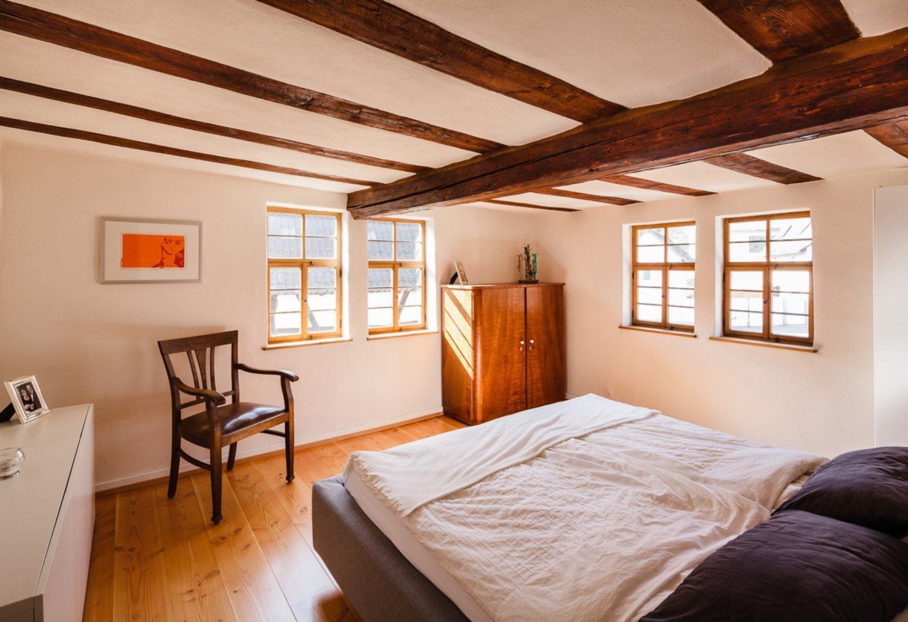 Liederbach ist ein in seinen historischen Wurzeln gut erhaltener Ort. Deutlich kann man die Altsiedlung Niederhofheim mit seinen klassischen Hakenhofreiten im Stadtgrundriss erkennen. Der städtebauliche Bestand galt als Grundlage für die Neukonzeption des Wohnhauses. Der 3-zonige Fachwerkbau aus 1769 wurde umfassend entkernt und fachgerecht mit Lehm, Kalk und Holz wiederaugebaut. Geachtet haben wir darauf, dass das historische Bild wieder herausgearbeitet wurde... die Baustelle wurde von Phase zu Phase optisch älter. Die Fassade wurde in Ihre Bauabschnitte unterteilt, das Obergeschoss steht noch mit seiner barocken Ordnung und dazugehörigen Fenstern für den Ursprung des Hauses. Das Erdgeschoss für die wohl erste große Sanierungsphase, bei dem Fachwerk aus- und Mauerwerk eingebaut wurde. Dabei ging man auch bei den Fenstern mit der Zeit. Ganz neu, jedoch in seiner Erscheinung gar nicht prätentiös, wurde der Wohnbau um ein fehlendes Nebengebäude für Abortanlagen, Waschplatz und Waschküche erweitert. Somit ist die historische Struktur vom schädlichen Wasser befreit und ein moderner und fachgerechter Aufbau der Nassbereiche möglich geworden.