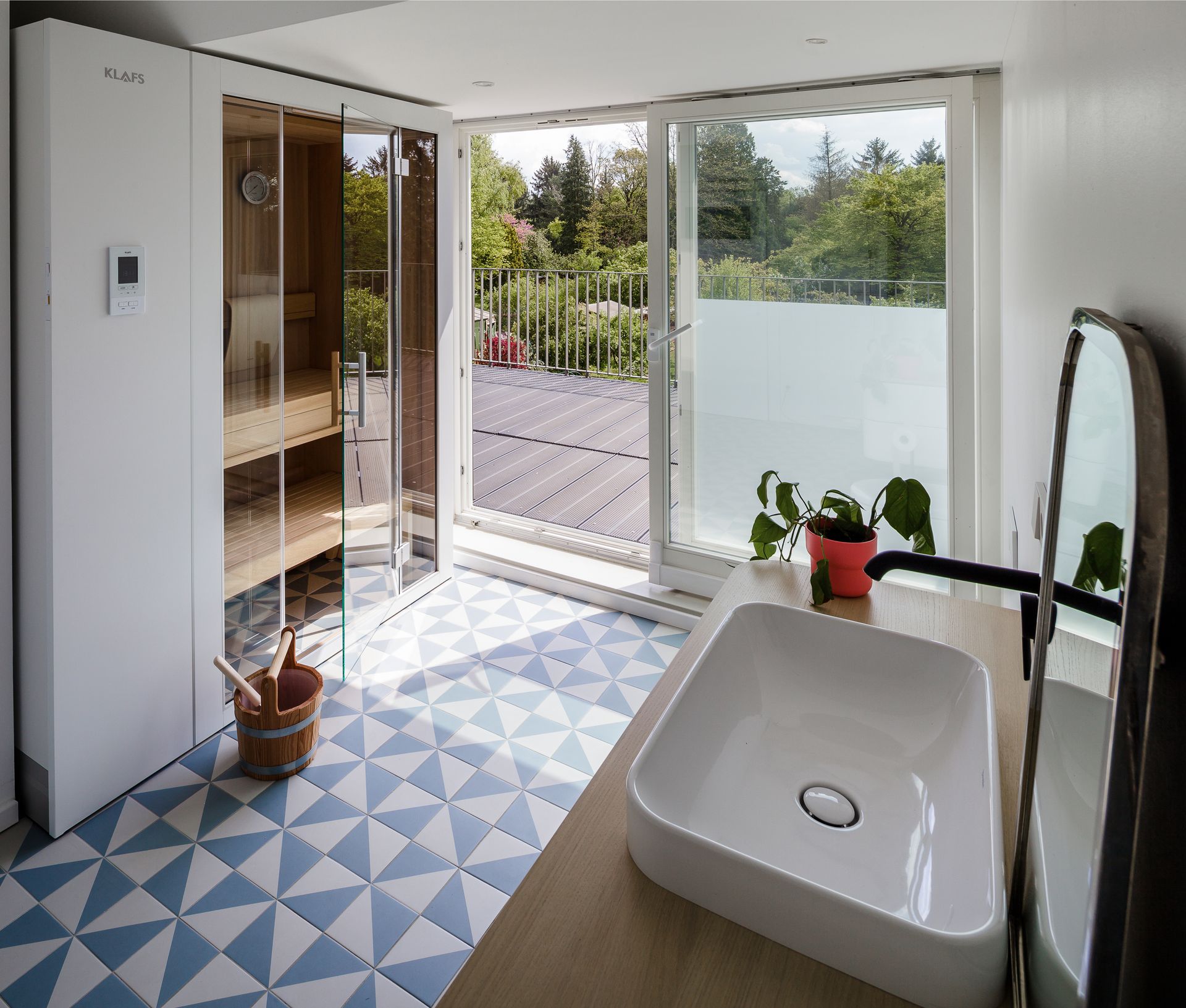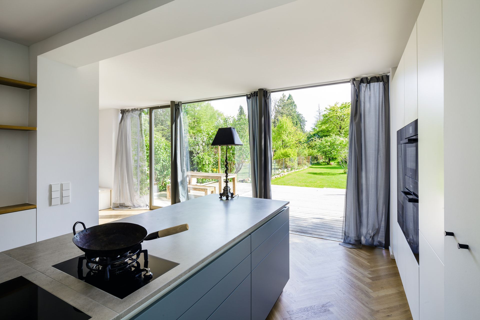 Das Erdgeschoss wurde fast vollständig ausgehöhlt und mit dicken Stahlträgern zu einem großzügigen Wohnraum mit Küche und Essbereich umgestaltet. Von letzteren lässt es sich einfach auf die riesige Terrasse ausweichen, die hinab in den Garten führt, der viel Platz für Spaß und Spiel bietet. Ohne viel Aufregung haben wir in die Wohnebene noch ein Musikzimmer und eine Gästebad integriert.... leider sperren sich die Bauherrn noch vor der "richtigen" Wahl der Garderobe, die das historische Treppenhaus etwas besser aus dem Grundriss separieren würde. Aber sei es drumm...Das Obergeschoss wurde den drei Kindern überlassen. Separates WC nebst Familienbad, Hauswirtschaftsraum und offener Spielbereich runden die Nutzung der Etage ab, bevor es nach oben zu den Eltern geht, die sich etwas Ruhe verdient haben. Die Gaube nach hinten wurde nicht ganz so historisch wie zur Strasse hin, dennoch selbstbewusst mittig vor das Flachdach des Anbaus gesetzt und mit einer Dachterrasse versehen. Betreten wird sie vom Elternbad mit ausziehbarer Sauna sowie vom Schlafzimmer. Weiter finden sich ein Gästezimmer in der Etage sowie ein Ankleidezimmer mit Treppen-Schrank, der in den Dachspitz führt und dann das kleine Luken-Geheimnis lüftet.