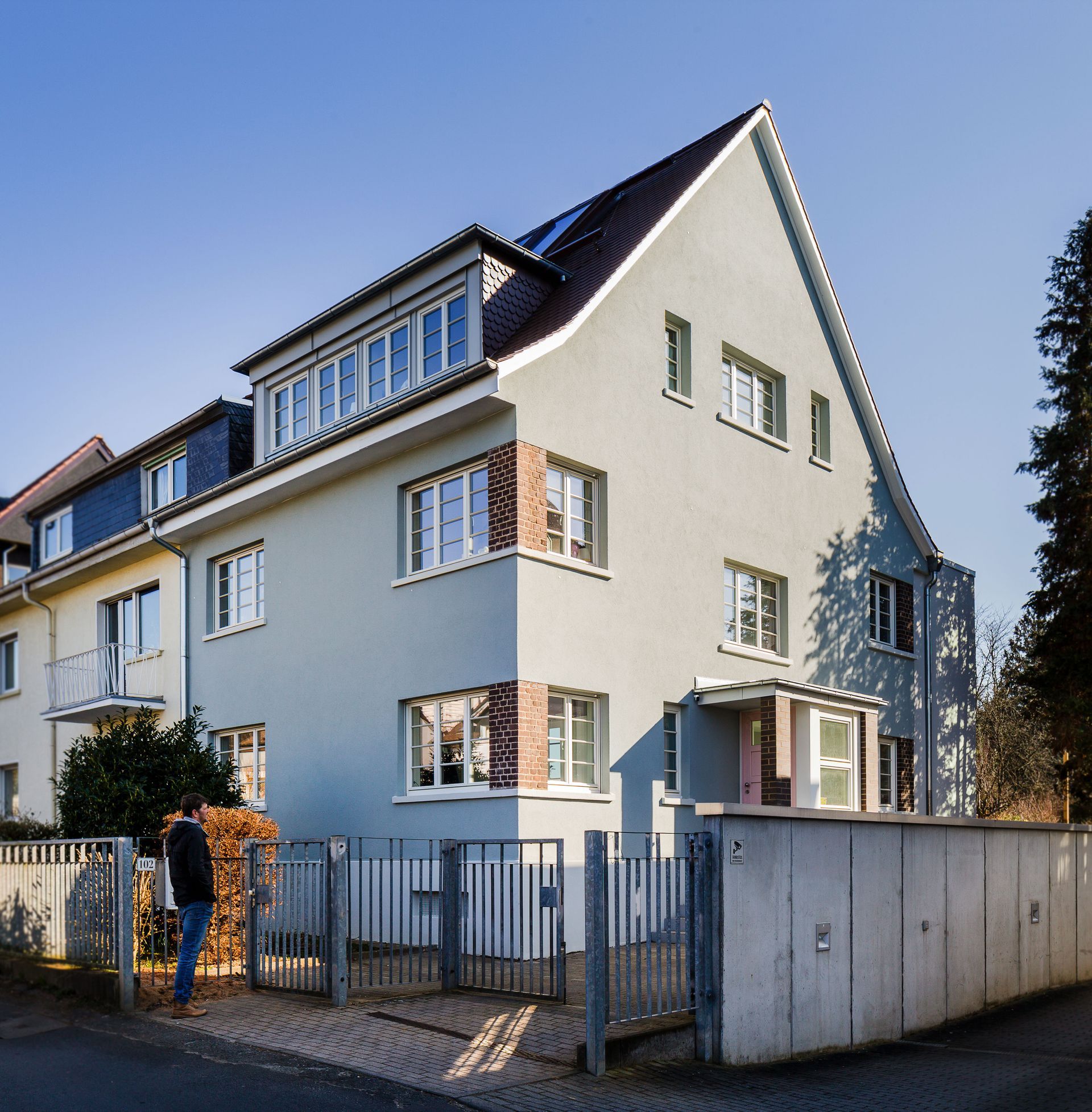 Stolz sind wir auf die tatsächlich traditionsbewusste Ausgestaltung des Doppelhauses: Dem Haus wohnt der Geist der 30er inne, zeigt sich selbstbewusst in seiner Farbe mit roséfarbenem Eingang und mit seiner spiegelgleichen Giebelseite, die genau so überhaupt gar nie wahr war. Auch der Anbau macht uns als Architekturbüro glücklich; unterhalb der Traufe untergräbt der Anbau nicht die Dominanz seines Ursprungs. Und im Innen wartet das Projekt mit lichtdurchfluteten Räumen auf. Eine quirlige Ausstattung gepaart mit Raum schafft Platz für alle wilden Projekte, die der junge Familie so vorschweben: Hühner im Garten, Baumhaus bauen, Buddelhügel hinterm Trampolin und Swimmingpool mit Sprungblock vom Terrassenrand. Es ist ein schöner Ort geworden um ganz Alt zu werden... ganz nah an der City und dennoch draußen vom richtigen Trubel und ein bisschen das Gefühl von großer Kleingarten-Romantik; schön anzuschauen, was Traditionelles, mit Herz und Seele, was klein sein darf und auch "Erwachsen" kann. Ein guter Ort!