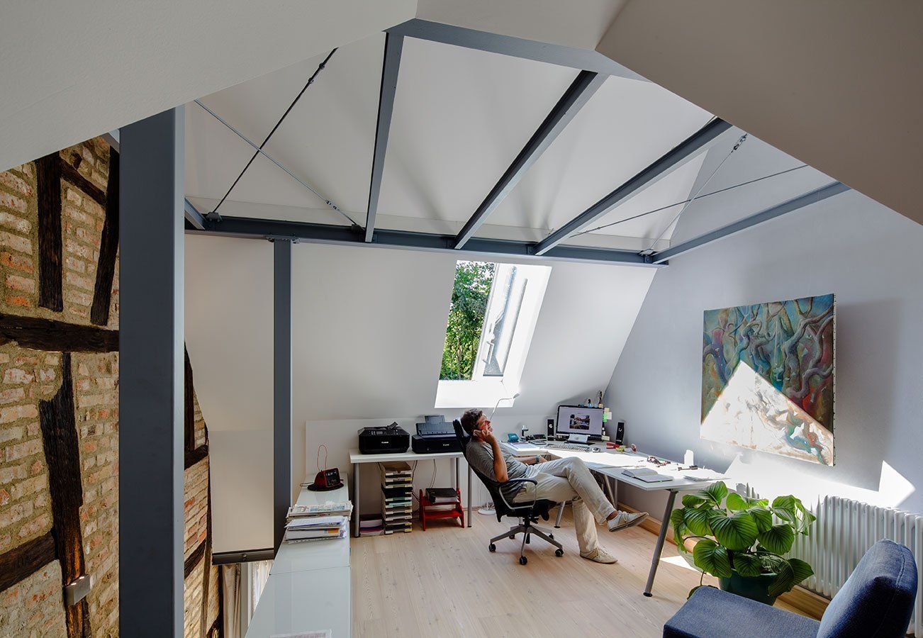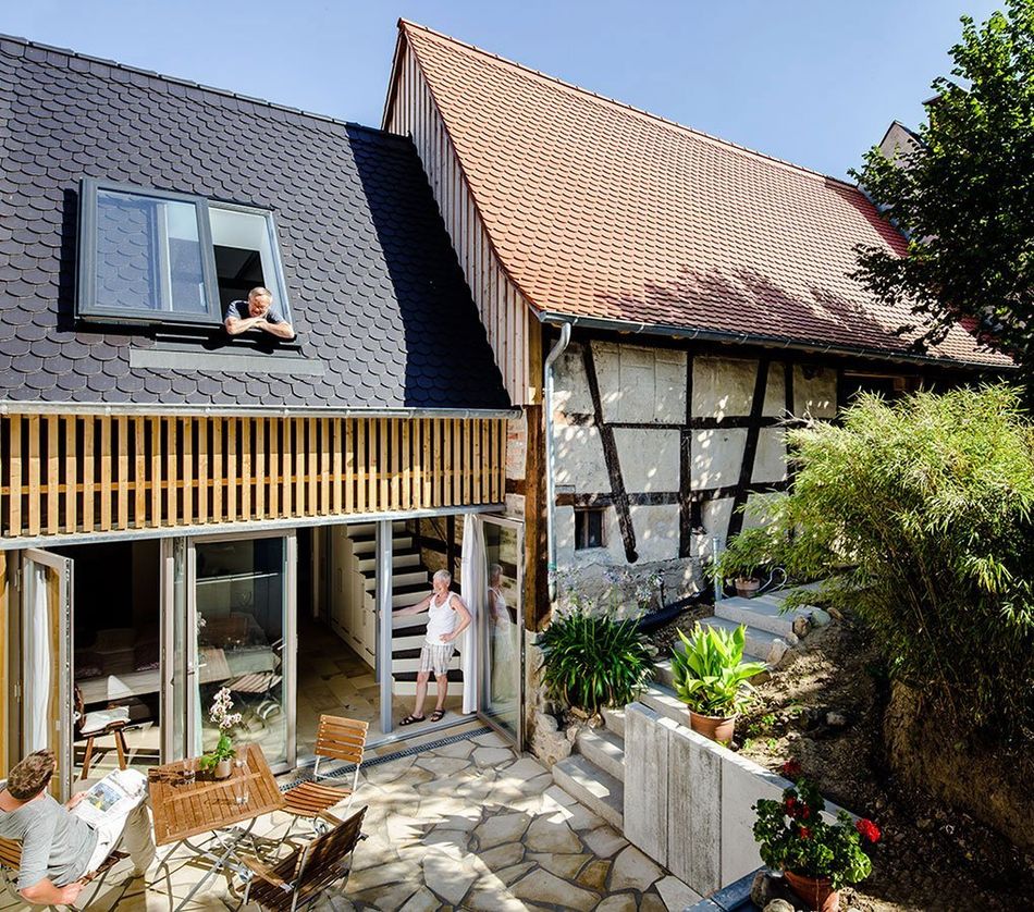 Es gibt selten Projekte auf die man neidisch sein kann. Dieses jedoch ist ein ganz besonders eifersüchtig machendes. Die Bauherrschaft kam nach erfolglosem Start mit einem Kollegen auf unser Büro zu sprechen. Wunsch des Rentnerehepaares war es, die angrenzende Scheune um ein paar Quadratmeter nach oben zu erweitern und vor allem eine altersgerechte Erschließung in die Schlafräume im Obergeschoss bzw. Dachgeschoss zu generieren. Bis hier hin hatte das Haus schon zwei Treppen, beide jenseits jeder Norm, und vor allem für das Alter ziemlich ungeeignet. Gefüttert wurde das Vorhaben noch von dem Gedanken, das Objekt noch einmal für die Zukunft zu ordnen, denn zahlreiche "Bastelmaßnahmen" aus den Nachkriegsjahrzehnt haben das Ensemble deutlich verzerrt. Unser Büro nahm sich dem Anfordernungskatalog an und veränderte das Konzept grundlegend. Aus der Erweiterungsmaßnahme nach oben wurde eine ebenerdige Maßnahme in die Länge. Das "Gebastel" mit dem engen Treppenhaus wurde vollständig abgerissen und schuf Platz für das neue, dem Garten zugewandte Schlafzimmer. Dem Anspruch nach mehr Fläche wurde im neu darüber positionierten Dach entsprochen. Hier zeigt sich heute ein moderner, offen großzügiger Hobby- und Arbeitsbereich, der vom Dachgeschoss des historischen Wohnhauses sowie über die neue Treppe als Schrankmöbel ordentlich erschlossen ist. Das Schlafzimmer streckt sich mit maximaler Glasausbeute dem Garten entgegen. Die Fassade ist zu 75 Prozent der Terrasse hin zu öffnen. Der tiefliegende, dadurch gemütliche und warme Platz in Richtung der untergehenden Sonne lässt die Grenzen zwischen Drinnen und Draußen verschwinden. Plätscherdes Wasser vom neuen Teich auf altersgerechter Höhe dringt bei offenen Fenstern ins Schlafzimmer hervor und der großzügige natürliche Garten lässt die Bauherren das vor Jahrzenten liebevoll sanierte Fachwerkwohnhaus fast vergessen. "Wir sind gar nicht mehr vorne! Nur noch zum Kochen! Das Esszimmer wird wohl erst im Winnter wieder zu nutzen sein!" Vielleicht ist es komisch eine Terrasse in Folge eines Schlafzimmerz zu planen. Aber genau in diesem Fall war es vollkommen richtig! Und nun denken Sie einmal darüber nach, wenn Sie an einem Samstagmorgen aufwachen würden und Sie könnten hoch in einen Garten sehen, die Fenster sind auf, Wasser plätschert vor sich hin und man wird dazu eingeladen sich noch einmal umzudrehen und dem Konzert der Natur zu lauschen!? Es gibt ja die Behauptung wir würden unsere Projekte für uns selbst entwickeln und heimlich mit einziehen wollen. In diesem Fall wollen wir einer Gegenbehauptung nicht stand halten! Zugegeben: "Wir sind neidisch!"
