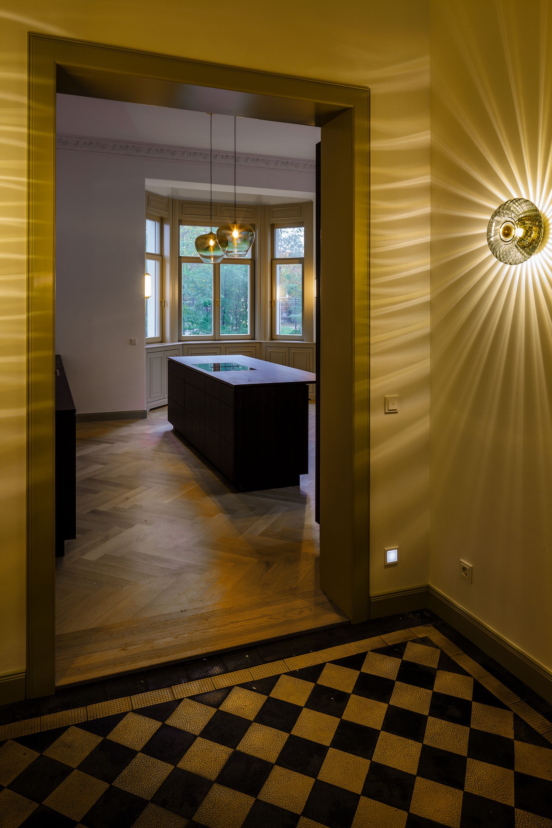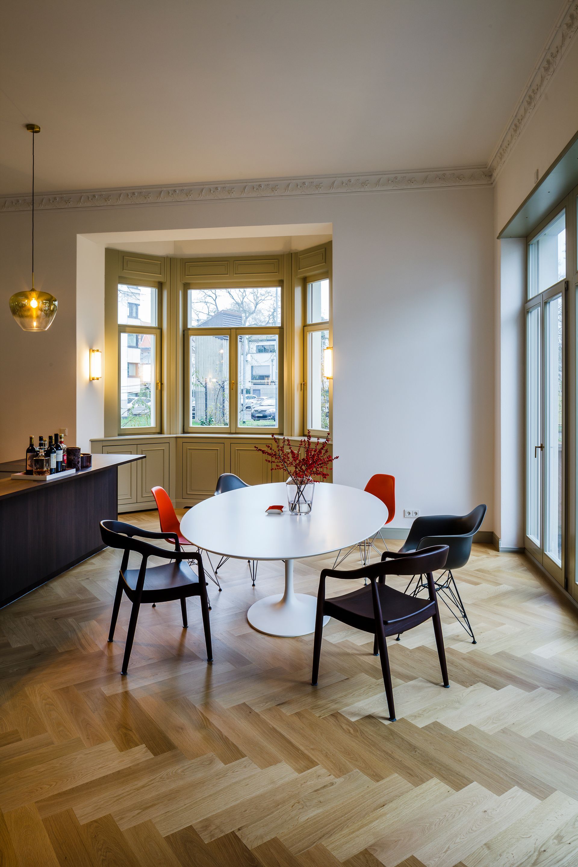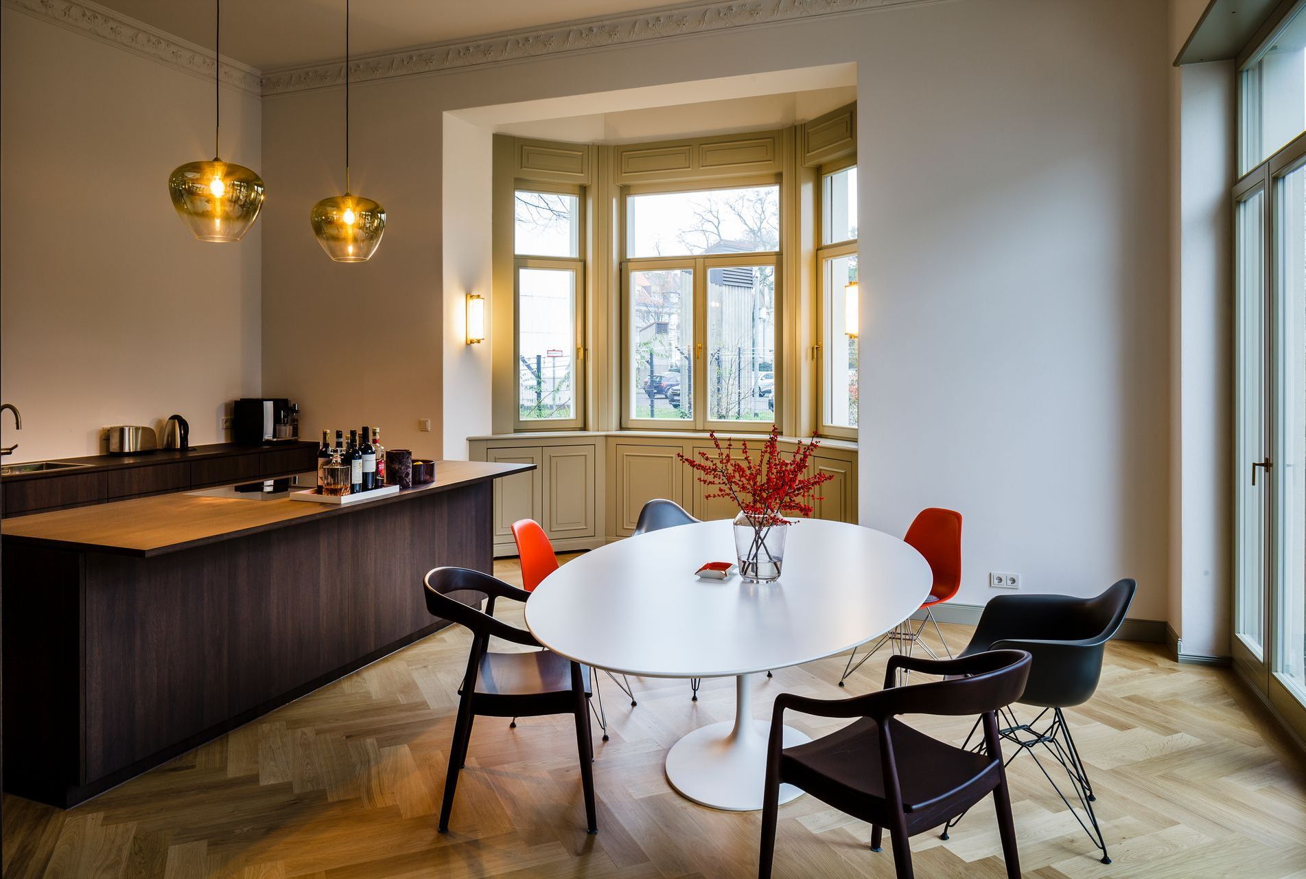 Unsere Aufgabe war es, das halbseitig gelähmte Gebäude mit all seinen etwas unpassenden Protesen aus den Nachkriegsjahren in Kur zu senden und es mittels dem Proportionsportfolio der historistischen Zeit wieder neu aufzubauen. Wichtigstes und heute markantestes Detail ist das große Walmdach, welches wir auf der Statik des historisch einmal dagewesenen wieder errichten ließen. Allerdings ließ sich das Dach nicht an genau historischer Stelle nieder sondern aufgrund der Nachkriegsaufstockung mit rund 1,50 Meter höherer Traufe und auch ähnlich höherem First. Während das Original einmal einen reinen Fachwerkaufbau hatte, konnte unsere Rekonstruktion auf Stein gebaut werden. Der optisch fehelende Fachwerkgurt wurde durch den Vorbau einer zweigeschossigen Balkonanlage geschaffen, der zumindeist die Hauptfassade optisch wieder repariert. Während die seitliche Fassade lediglich durch den Wiederaufbau des erdgeschossigen Erkers und proportional angepasster Fensteröffnungen profitiert wurden die in den Nachkriegsjahren kläglich geflickten Schäden wieder in das historische Format zurückgeführt. Heute sieht man nichts mehr von dem einstigen Bombentreffer und dennoch wurde der Schaden, den das Haus, die Spuren der Zerrstörung nicht gänzlich beseitigt und sehr subtil erlebbar gemacht. Der Kenner wird merken, dass mit dem Haus etwas nicht stimmt und hier etwas und jemand eingegriffen hat. Und dennoch ist dem Gebäude das Dogma der Notunterkunft genommen und die Klasse und Wohnlichkeit zurückgegeben worden, die es einst ihren Bewohnern weitergegeben hat. Die Villa ist wahrhaftig wie ein Phönix aus der Asche wiedererstanden.... die Wunden sind noch zu sehen, doch eher in der japanischen Tradition des Kintsugi.